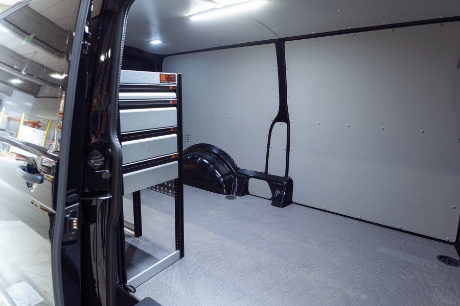 Leveän mallinen kalustesarja jonka laatikoihin pääsee helposti käsiksi. Sopiva autoon Ford Transit Custom L1H1.