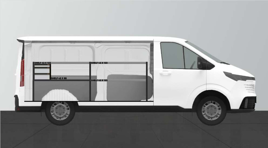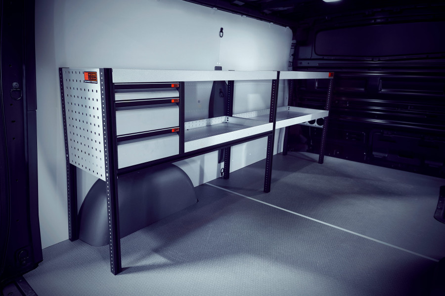 Edullinen vaihtoehto sinulle, joka tarvitset yksinkertaisempaa säilytysjärjestelmää ja haluat sekä kuulalaakerikiskoilla varustettuja laatikoita että hyllyjä autoosi MAXUS E-DELIVER 7 L2. Kalusteen 420 mm syvien hyllyjen ansiosta useimmat markkinoiden työkalulaukut sopivat siihen täydellisesti. Kuulalaakerikiskoilla varustettuja laatikoita täydentävät suositut laatikon sisäosat ja jakajat,joiden avulla laatikot on helppo pitää järjestyksessä.