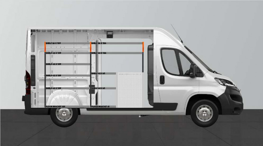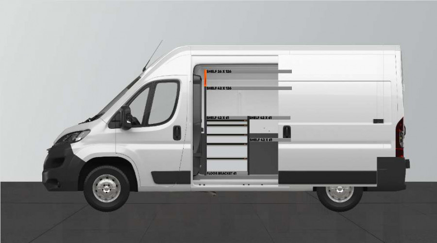 Tämä on yksi suosituimmista järjestelmistämme autoon Proace Max, Peugeot Boxer, Fiat Ducato, Citroen Jumper 2010- & Opel Movano 2021- L2, jossa on sivuovi kalusteen sisällä. Kaluste tarjoaa hyvät säilytysmahdollisuudet niin työkalulaukuille, koneille kuin pienille tarvikkeillekin. Saat myös laatikoston, jonka 5 erikokoista laatikkoa anntavat jokaiselle tavaralle oman paikkansa. Laatikoston takana on työkalutaulu, johon voidaan ripustaa tavaroita auton sisälle. Kuulalaakerikiskoilla varustettuja laatikoita täydentävät suositut laatikon sisäosat ja jakajat, joiden avulla laatikot on helppo pitää järjestyksessä. Päädyn täydentäminen Smartboxilla on myös suosittu vaihtoehto säilytystilan maksimoimiseksi.