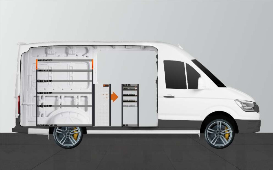 Yksi suosituimmista pakettiauton hyllyistä sinun MAN TGE & Volkswagen Crafter L3. Kalusteet tarjoavat monipuoliset säilytysmahdollisuudet, sillä kuulalaakerikiskoilla olevat vetolaatikot mahdollistavat helpon pääsyn sivuovesta ja laatikot voi vetää ulos ajosuunnassa hyvän näkyvyyden varmistamiseksi. Niitä voi täydentää laatikoiden jakajilla, jotta pienet tarvikkeet pysyvät hyvässä järjestyksessä. Syvät hyllymme tarjoavat myös hyvät säilytysmahdollisuudet sekä työkalulaukuille että pienemmille koneille. Kuulalaakerikiskoilla olevat laatikot kestävät 35 kg tasaisesti jaettua painoa. Laatikoiden sisämitat on (mm) L-308, S-387, K-60 sekä K-130.