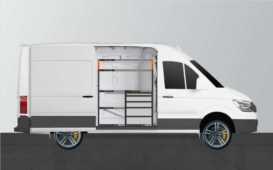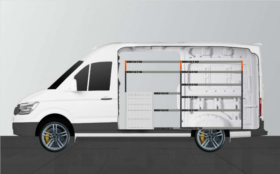 Tämä on yksi suosituimmista järjestelmistämme autoon MAN TGE & Volkswagen Crafter L3, jossa on sivuovi kalusteen sisällä. Kaluste tarjoaa hyvät säilytysmahdollisuudet niin työkalulaukuille, koneille kuin pienille tarvikkeillekin. Saat myös laatikoston, jonka 5 erikokoista laatikkoa anntavat jokaiselle tavaralle oman paikkansa. Laatikoston takana on työkalutaulu, johon voidaan ripustaa tavaroita auton sisälle. Kuulalaakerikiskoilla varustettuja laatikoita täydentävät suositut laatikon sisäosat ja jakajat, joiden avulla laatikot on helppo pitää järjestyksessä. Päädyn täydentäminen Smartboxilla on myös suosittu vaihtoehto säilytystilan maksimoimiseksi.