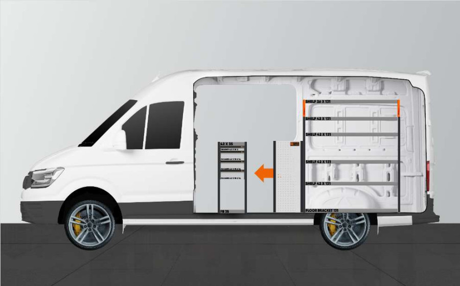 Yksi suosituimmista pakettiauton hyllyistä sinun MAN TGE & Volkswagen Crafter L3. Kalusteet tarjoavat monipuoliset säilytysmahdollisuudet, sillä kuulalaakerikiskoilla olevat vetolaatikot mahdollistavat helpon pääsyn sivuovesta ja laatikot voi vetää ulos ajosuunnassa hyvän näkyvyyden varmistamiseksi. Niitä voi täydentää laatikoiden jakajilla, jotta pienet tarvikkeet pysyvät hyvässä järjestyksessä. Syvät hyllymme tarjoavat myös hyvät säilytysmahdollisuudet sekä työkalulaukuille että pienemmille koneille. Kuulalaakerikiskoilla olevat laatikot kestävät 35 kg tasaisesti jaettua painoa. Laatikoiden sisämitat on (mm) L-308, S-387, K-60 sekä K-130.