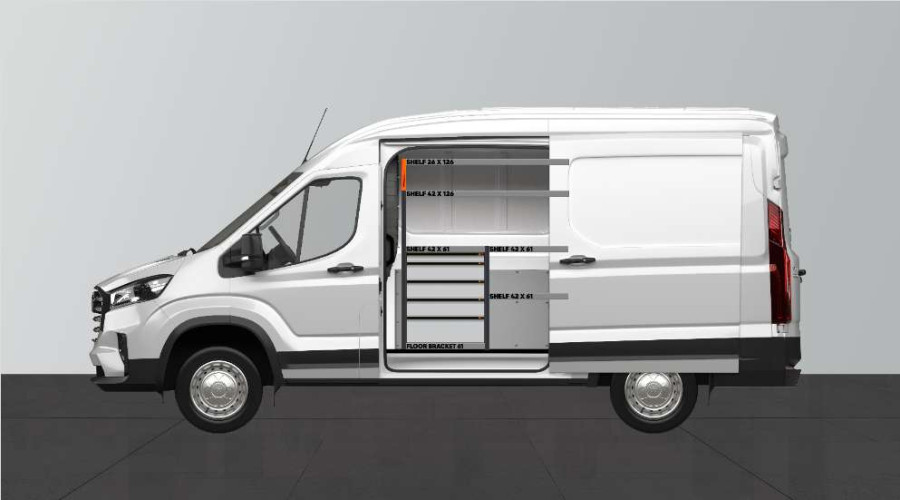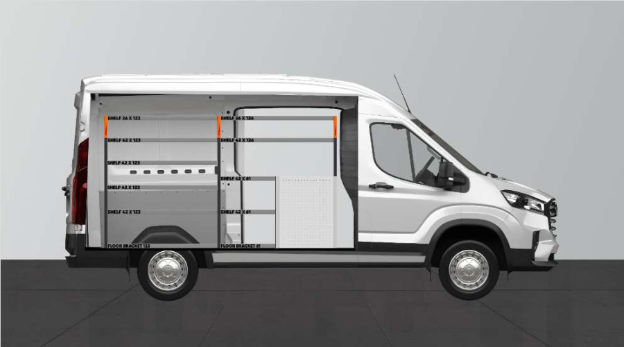 Tämä on yksi suosituimmista järjestelmistämme autoon Maxus e-Deliver 9 L2, jossa on sivuovi kalusteen sisällä. Kaluste tarjoaa hyvät säilytysmahdollisuudet niin työkalulaukuille, koneille kuin pienille tarvikkeillekin. Saat myös laatikoston, jonka 5 erikokoista laatikkoa anntavat jokaiselle tavaralle oman paikkansa. Laatikoston takana on työkalutaulu, johon voidaan ripustaa tavaroita auton sisälle. Kuulalaakerikiskoilla varustettuja laatikoita täydentävät suositut laatikon sisäosat ja jakajat, joiden avulla laatikot on helppo pitää järjestyksessä. Päädyn täydentäminen Smartboxilla on myös suosittu vaihtoehto säilytystilan maksimoimiseksi.