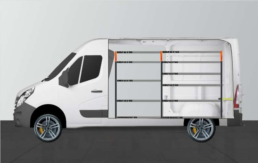 Autokaluste autoosi Opel Movano, Renault Master och Nissan NV400. Se tarjoaa hyvät säilytysmahdollisuudet niin työkalulaukuille, koneille kuin pienille tarvikkeillekin. Kalusteen 420 mm syvien hyllyjen ansiosta useimmat markkinoiden työkalulaukut sopivat siihen täydellisesti. Ylintä 262,5 mm:n syvyistä hyllyä voidaan täydentää moduulilaatikoilla, joiden avulla tavarat on helppo pitää järjestyksessä. Kannattaa hyödyntää myös päädyssä olevaa työkalutaulua.