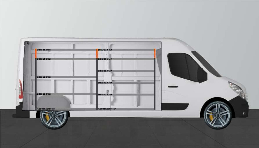 Autokaluste autoosi Opel Movano, Renault Master & Nissan NV400 L3. Se tarjoaa hyvät säilytysmahdollisuudet niin työkalulaukuille, koneille kuin pienille tarvikkeillekin. Kalusteen 420 mm syvien hyllyjen ansiosta useimmat markkinoiden työkalulaukut sopivat siihen täydellisesti. Ylintä 262,5 mm:n syvyistä hyllyä voidaan täydentää moduulilaatikoilla, joiden avulla tavarat on helppo pitää järjestyksessä. Kannattaa hyödyntää myös päädyssä olevaa työkalutaulua.