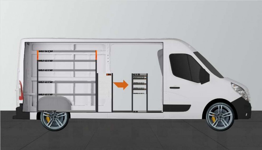 Täydennettynä laatikoiden ja hyllyjen yhdistelmällä tämä on erittäin suosittu autokaluste, joka sopii automalliin Talento, NV300 & Trafic L2.
