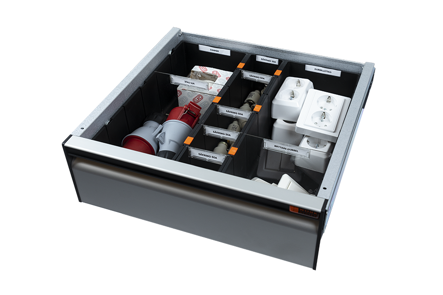 varje insatslåda och avdelare har ett etikettfack för att skapa de bästa förutsättningarna för ordning och reda i din transportbil.
