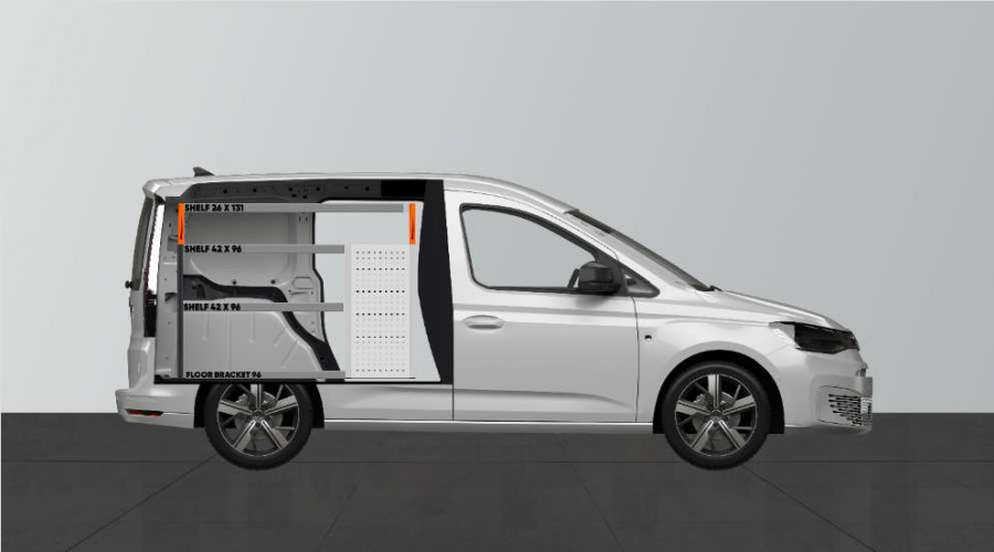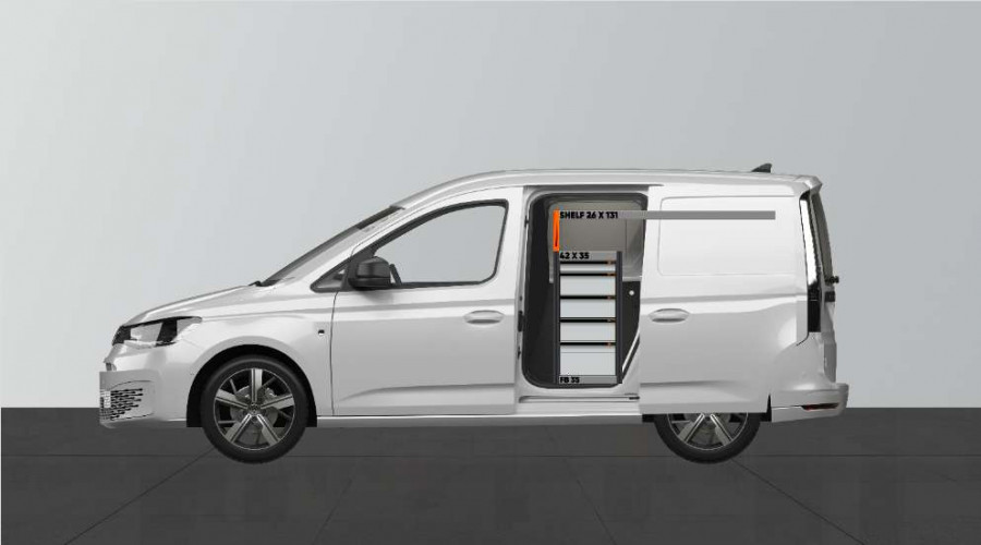 Detta är ett av de mest populära systemen till VW Caddy Cargo & Ford Connect L1 med sidodörr på inredningens sida. Inredningen ger bra förvaringsmöjligheter för såväl verktygsväskor och maskiner som det mindre sortimentet. Du får en lådhurts med 5st lådor i varierande storlekar för att ge var sak sin plats. Bakom lådorna är en verktygstavla placerad för extra hängmöjligheter i bilen. Lådorna på kullagerskenor kompletteras ofta med våra nya lådinsatser och avdelare för att skapa bästa struktur. Att komplettera gaveln med vår smartbox är också ett populärt alternativ för att maximera förvaringsutrymmet.