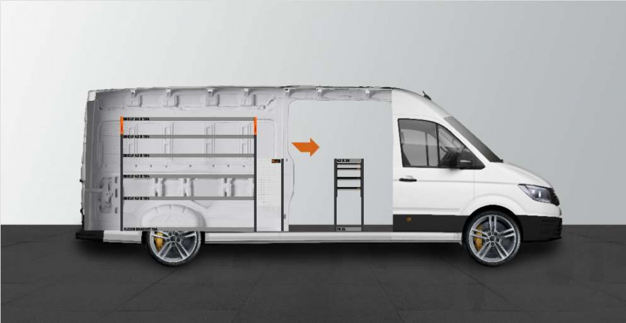 En av de mest populära inredningarna till MAN TGE & Volkswagen Crafter L4. Inredningen ger varierande förvaringsmöjligheter då lådorna på kullagerskenorna ger smidig åtkomst via sidodörren samtidigt som lådorna kan dras ut i färdriktningen för att ge en bra överblick. Dessa går att komplettera med lådavdelare för att maximera strukturen bland det mindre sortimentet. Våra djupa hyllor ger även bra förvaringsmöjligheter för såväl verktygsväskor som mindre maskiner. Fördelad lastvikt i lådorna på kullagerskenor är 35kg/st. Lådornas innermått är (mm) B:308, D:387, H:60 och H:130.