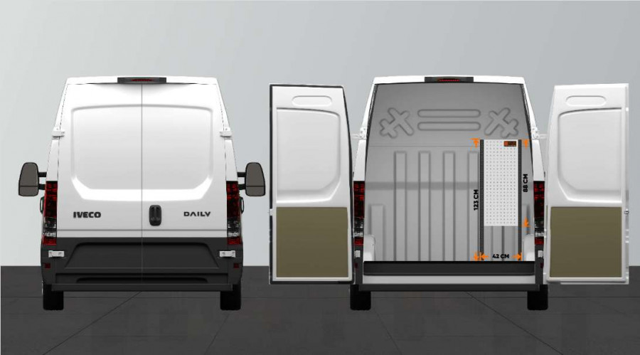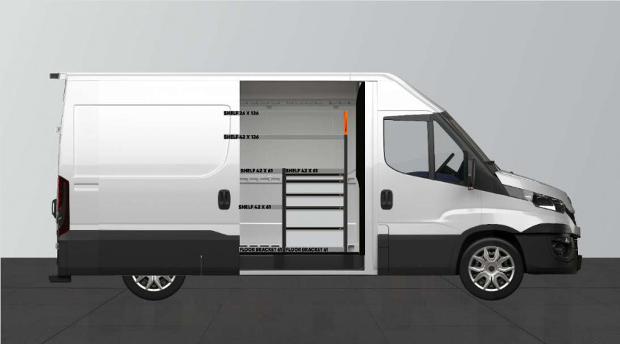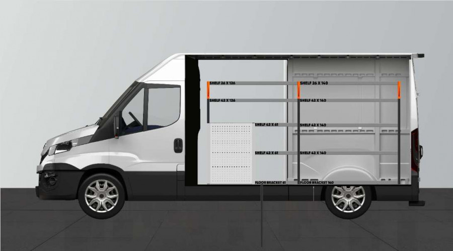 Med denna bilinredning får du mycket förvaring i både hyllor och lådor passande Iveco Daily L2.