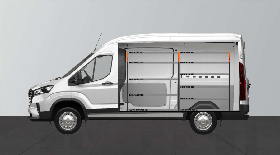 Med vår bilinredning BASE42 får du gott om förvaring i din Maxus e-Deliver9 L2.