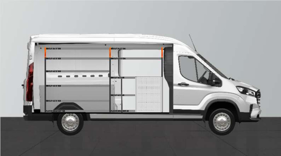 Med denna bilinredning får du mycket förvaring i både hyllor och lådor passande Maxus e-Deliver9 L3.
