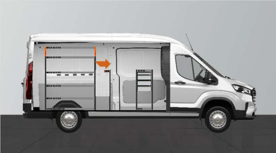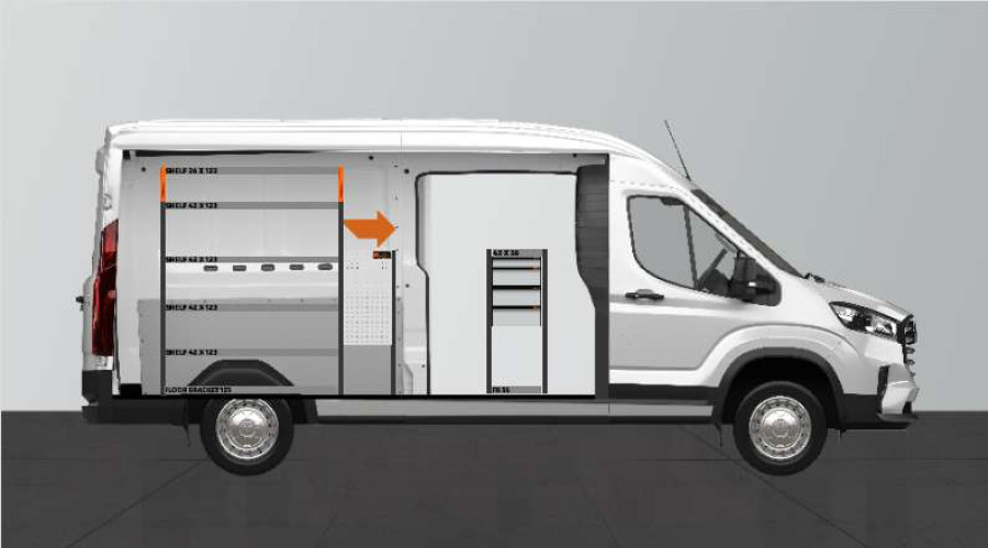 En av de mest populära inredningarna till Maxus e-Deliver9 L3. Inredningen ger varierande förvaringsmöjligheter då lådorna på kullagerskenorna ger smidig åtkomst via sidodörren samtidigt som lådorna kan dras ut i färdriktningen för att ge en bra överblick. Dessa går att komplettera med lådavdelare för att maximera strukturen bland det mindre sortimentet. Våra djupa hyllor ger även bra förvaringsmöjligheter för såväl verktygsväskor som mindre maskiner. Fördelad lastvikt i lådorna på kullagerskenor är 35kg/st. Lådornas innermått är (mm) B:308, D:387, H:60 och H:130.