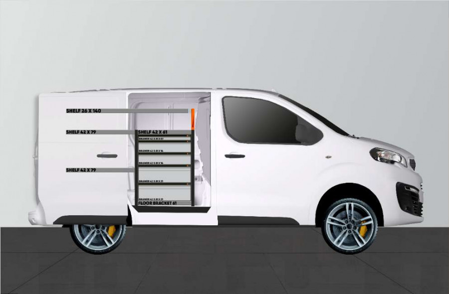 Detta är ett av de mest populära systemen till Peugeot Expert, Citroen Jumpy, Opel Vivaro, Fiat Scudo & Toyota ProAce med sidodörr på inredningens sida. Inredningen ger bra förvaringsmöjligheter för såväl verktygsväskor och maskiner som det mindre sortimentet. Du får en lådhurts med 5x lådor i varierande storlekar för att ge var sak sin plats. Bakom lådorna är en verktygstavla placerad för extra hängmöjligheter i bilen. Lådorna på kullagerskenor kompletteras ofta med våra nya lådinsatser och avdelare för att skapa bästa struktur. Att komplettera gaveln med vår smartbox är också ett populärt alternativ för att maximera förvaringsutrymmet.