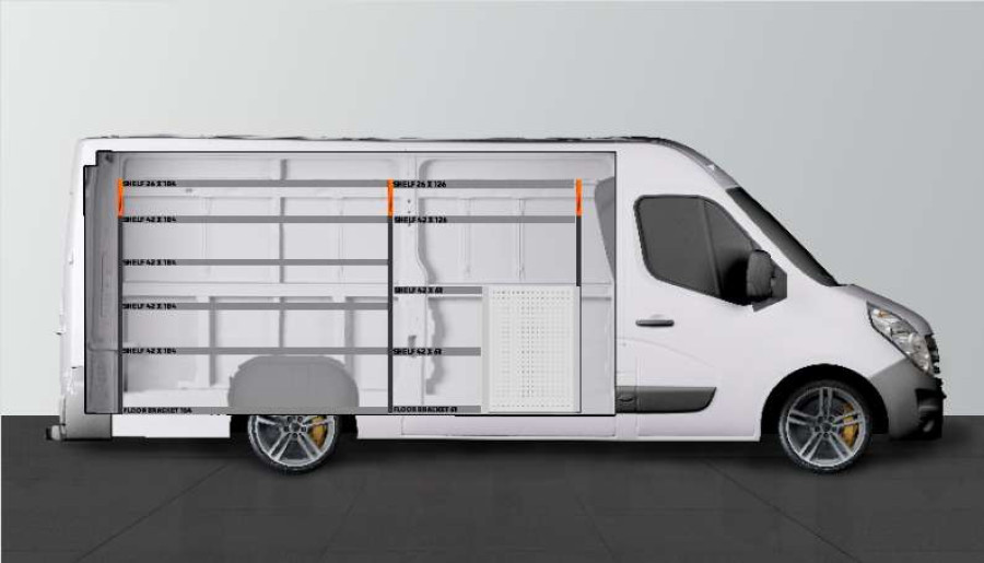 Med denna bilinredning får du mycket förvaring i både hyllor och lådor passande Movano, Master & NV400 L3.