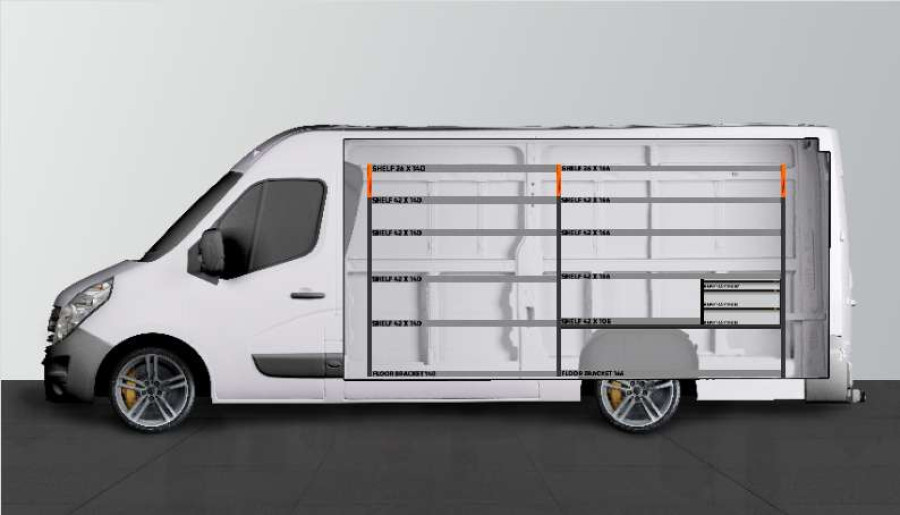 Detta är en av våra mest populära bilinredningar till Opel Movano, Renault Master & Nissan NV400 L3. LS3-inredningen används av såväl fastighetsskötare som servicetekniker, elektriker, VVS:are och snickare. Inredningen ger bra förvaringsmöjligheter för både verktygsväskor, maskiner, förbrukningsmaterial och ditt minsta sortiment. Lådorna kompletteras ofta med våra lådinsatser och avdelare medan gaveln är populär att komplettera med vår smartbox för att maximera förvaringsutrymmet.