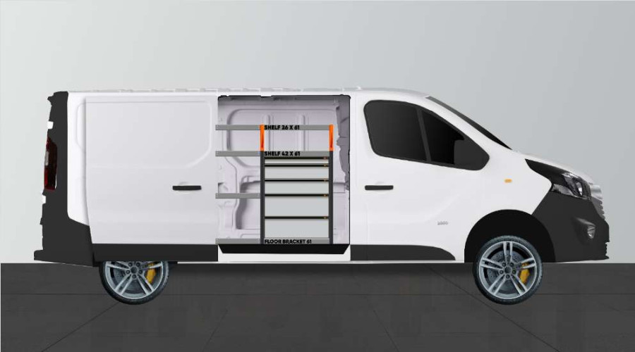 Detta är ett av de mest populära systemen till Nissan NV300, Renault Trafic & Fiat Talento L2 med sidodörr på inredningens sida. Inredningen ger bra förvaringsmöjligheter för såväl verktygsväskor och maskiner som det mindre sortimentet. Du får en lådhurts med 5st lådor i varierande storlekar för att ge var sak sin plats. Bakom lådorna är en verktygstavla placerad för extra hängmöjligheter i bilen. Lådorna på kullagerskenor kompletteras ofta med våra nya lådinsatser och avdelare för att skapa bästa struktur. Att komplettera gaveln med vår smartbox är också ett populärt alternativ för att maximera förvaringsutrymmet.