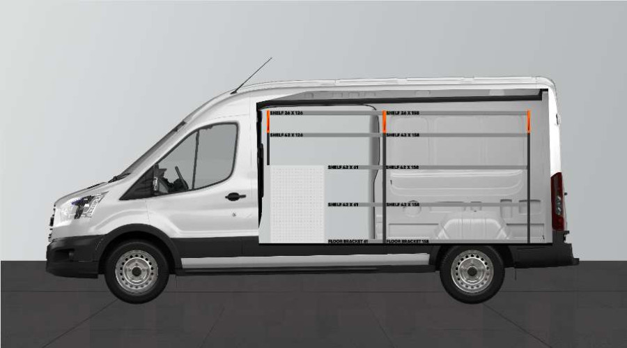 Detta är ett av de mest populära systemen till Ford Transit L3H2 med sidodörr på inredningens sida. Inredningen ger bra förvaringsmöjligheter för såväl verktygsväskor och maskiner som det mindre sortimentet. Du får en lådhurts med 5st lådor i varierande storlekar för att ge var sak sin plats. Bakom lådorna är en verktygstavla placerad för extra hängmöjligheter i bilen. Lådorna på kullagerskenor kompletteras ofta med våra nya lådinsatser och avdelare för att skapa bästa struktur. Att komplettera gaveln med vår smartbox är också ett populärt alternativ för att maximera förvaringsutrymmet.
