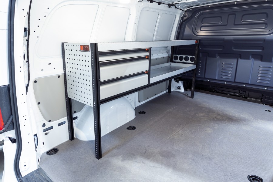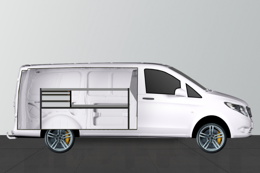 Ett billigt alternativ för dig som vill ha en kombination av lådor på kullagerskenor men även mycket förvaringsalternativ i form av hyllor till din Mercedes Vito Lång. Inredningen är 420mm djup vilket gör att de flesta av marknadens verktygsväskor passar perfekt i hyllorna. Lådorna är populära att komplettera med våra nya sortimentlådor. Detta ger dig bra möjligheter att skapa ordning och reda på ditt mindre sortiment.