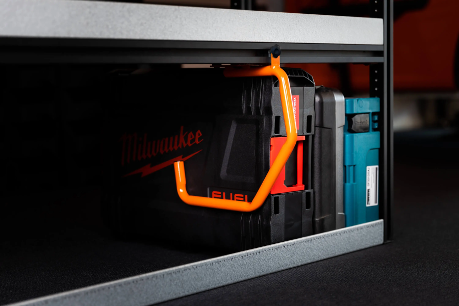 Förvara dina maskinväskor effektivt med vårt väskstöd. Inbyggd förspänning håller väskorna på plats – ingen manuell låsning krävs.